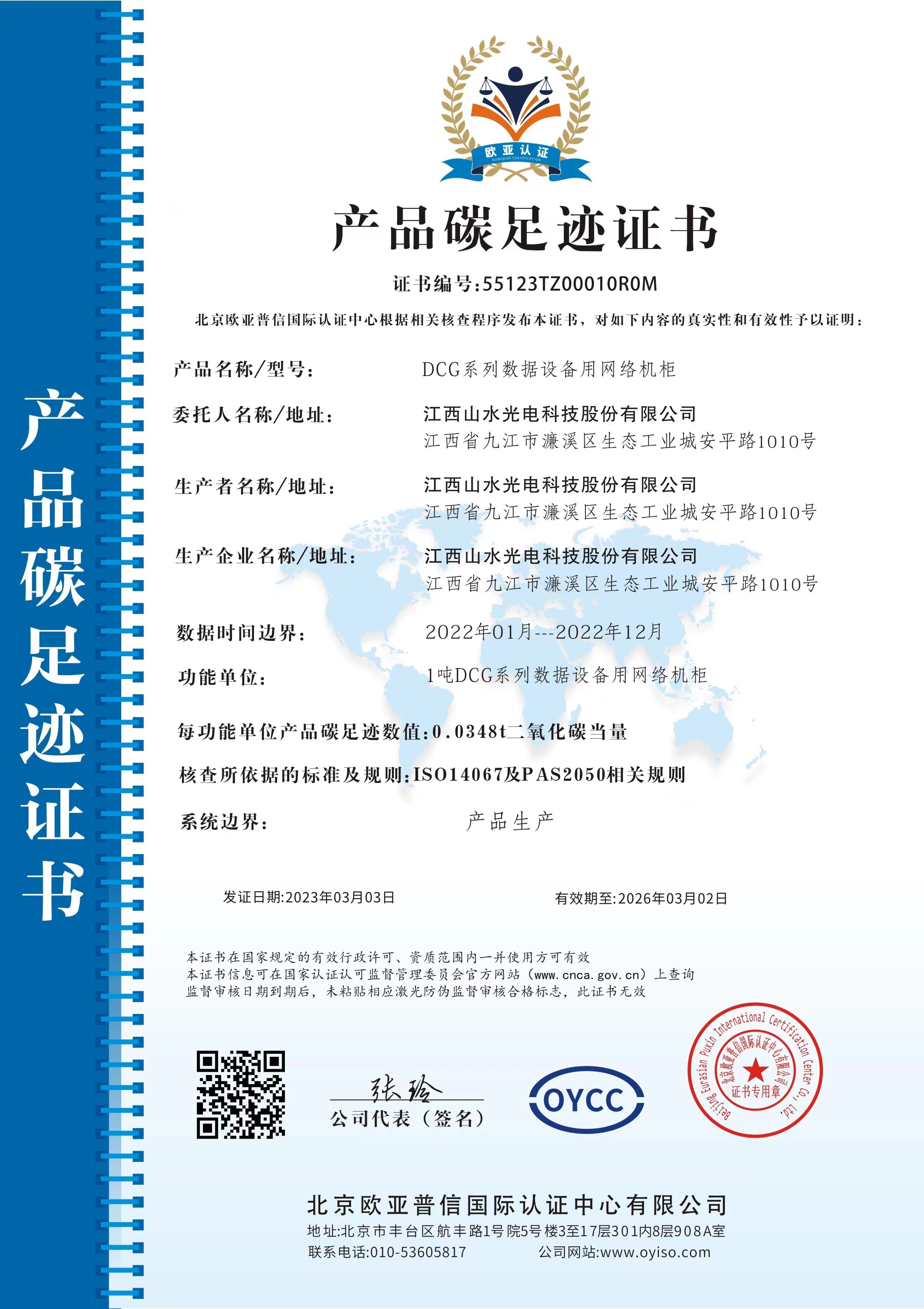 江西山水光電科技股份有限公司2022年度網(wǎng)絡(luò)機(jī)柜碳足跡已通過(guò)北京歐亞普信國(guó)際認(rèn)證中心核查并認(rèn)證,相關(guān)證書見附件。